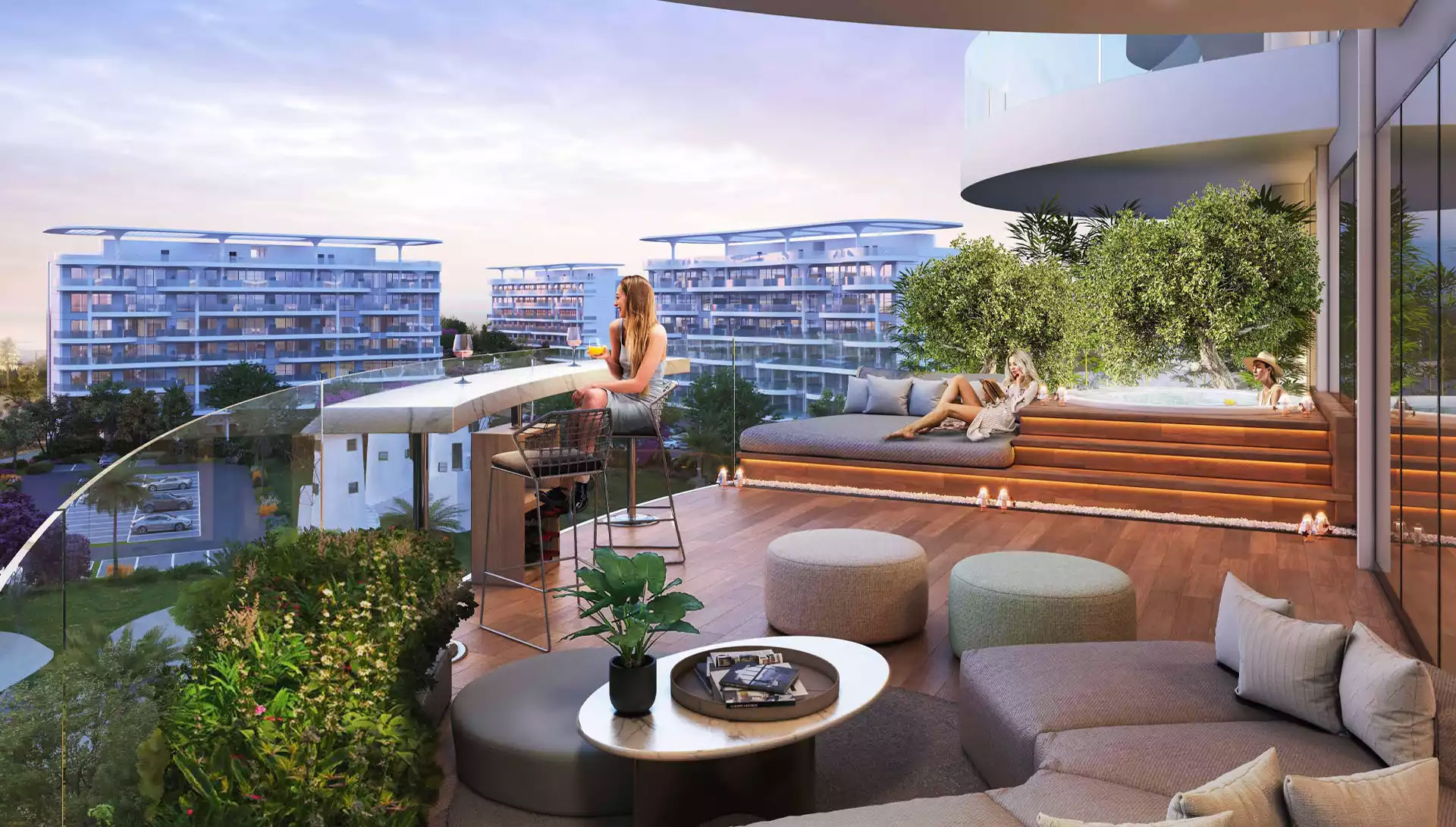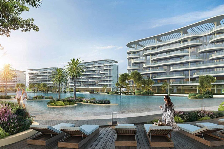 Marvel at sleek, curved exteriors by the lagoon, where Mediterranean living meets luxury amidst serene water features and greenery, with sweeping balconies seamlessly blending indoor and outdoor spaces.